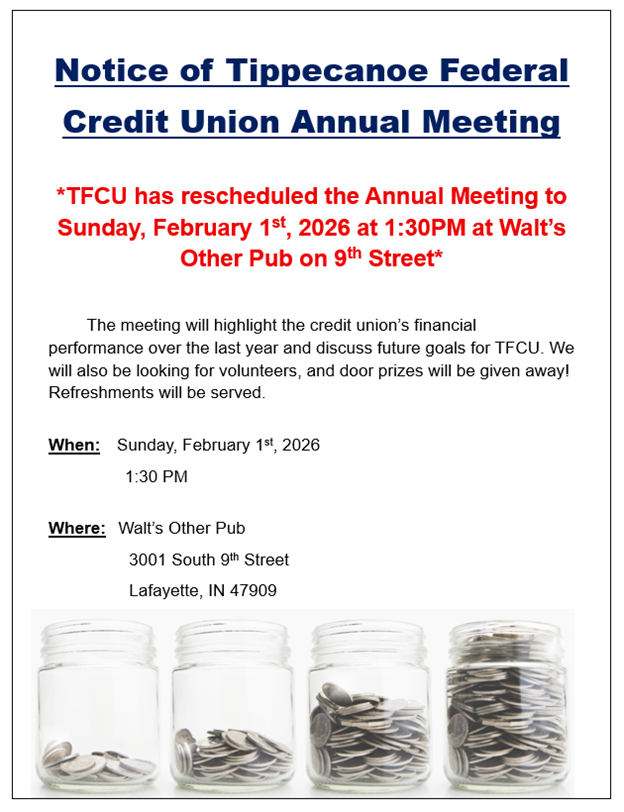Tippecanoe Federal Credit Union was first opened in 1953. TFCU is a closed membership credit union. The credit union is a member-owned financial cooperative providing banking services to multiple member groups; primarily serving federal, state, and local government employees. Membership is also open to immediate family members of current members. After more than 70 years of service, TFCU has grown to serve over 3,500 members.